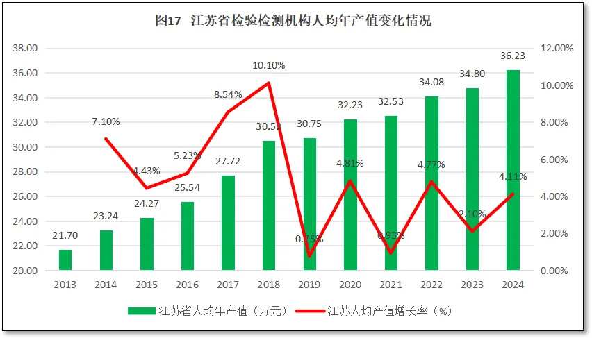 人均年产值是衡量检验检测机构经营运行质量的直观指标。2024年度,江苏省检验检测机构人均年产值36.23万元,高于30万元的行业温饱线,也高于2024年度全国31.45万元的平均值,排名居于全国第7位(由高到低排序,排名与2023年度持平)。这表明江苏地区检验检测机构总体经营状况良好,整体上已经居于“小康”区间。过去12年江苏省检验检测机构人均年产值的变化情况如图17所示。
