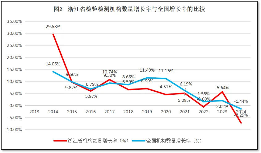 浙江省检验检测机构数量增长率与全国检验检测机构数量的增长率进行比较,结果如图2所示。