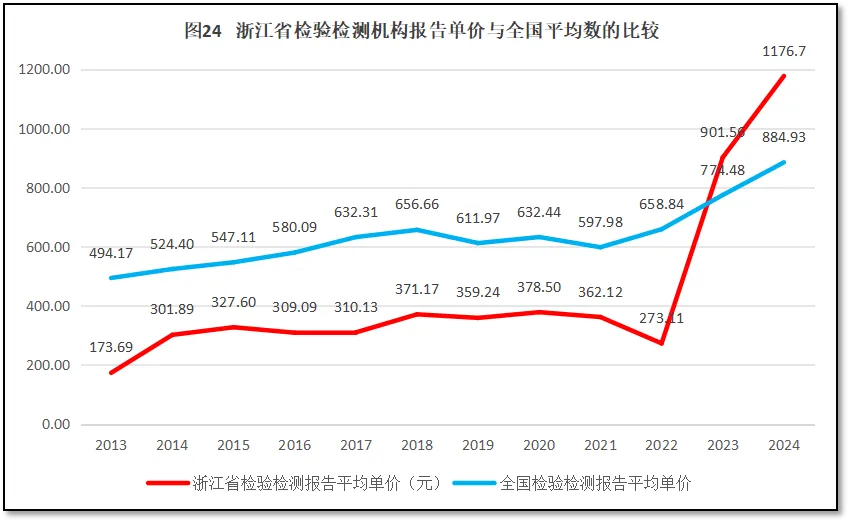 由图24可见,2022年之前,浙江省检验检测报告的单价一直比全国平均水平要低,只有全国平均数的一半左右,直到2023年才出现反超。2024年度浙江省检验检测报告平均单价达到1176.7元,比全国平均水平高291.77元,排名全国第8位,较2023年度提升2位。可能因为统计口径调整,再叠加企业委托形式改变,浙江省检验检测机构出具报告的平均单价最近几年增长很快,单份检验检测报告的附加值更高,检验检测市场运行状况显得更加成熟有序。