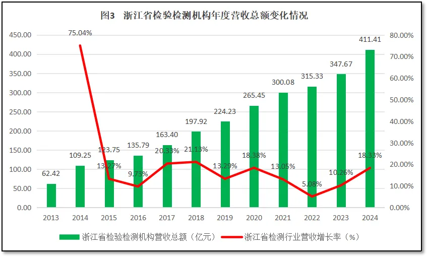 由图3可见,过去12年,浙江省检验检测机构年度营收增长很快,2024年末的行业年度营收总额达到411.41亿元,是2013年的6.59倍,年均增速达到19.81%。从增长率来看,除了头两年因统计数据质量不高导致曲线波动巨大之外,浙江省检验检测机构营收总额基本保持在高位波动,2015年以来年均增速保持在14.3%左右,增速十分平稳。即使最近几年经济下行导致全行业不景气,浙江省检验检测机构的营收总额仍保持了较高的同比增速,最近两年增长率还有持续提升的趋势,显示出较好的发展势头。