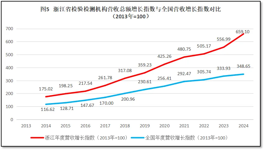 由上图可见,浙江省检验检测机构营收总额增长指数一直保持着高于全国平均数的水平发展,曲线始终高于全国平均线,显示出较强的发展实力。且随着时间的推移,浙江省检验检测机构营收增长指数还逐步拉大了与全国平均数的差距,到2024年增长指数相差接近310,说明浙江省检验检测行业发展质量较高,检验检测机构营收状况总体良好。