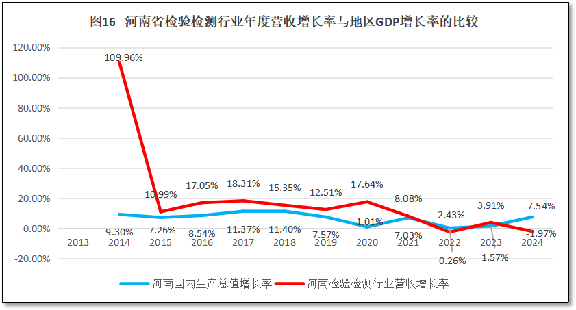 河南省GDP年度增长曲线与河南省检验检测机构年度营收总额增长曲线的比较,如图16所示。