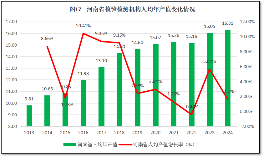 由图17可见,过去12年,河南省检验检测机构人均年产值总体保持增长,2024年达到16.31万元,是2013年的1.66倍。从增长率来看,在2016-2018年,河南省检验检测机构人均年产值增长较快,但从2018年以后逐年下降,2022年甚至出现人均年产值的“净下降”。2023年,河南省检验检测机构人均年产值增幅有所反弹,但2024年增长率有一次下跌,没有出现预期中的持续提升,说明推动行业提升发展质量的动力不足。