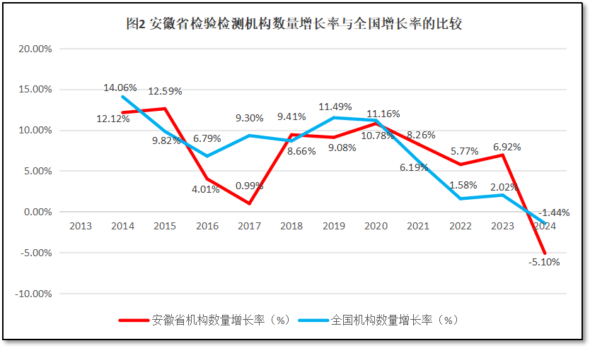 河南省检验检测机构数量增长率与全国检验检测机构数量的增长率进行比较,如图2所示。