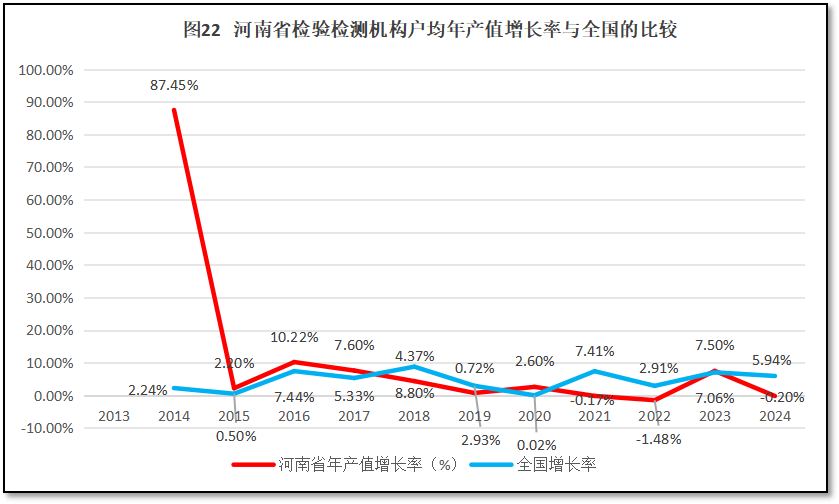 再来看河南省检验检测机构人均年产值增长率与全国人均年产值增长率的比较,如图19所示。