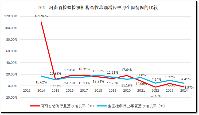 由图3可见,2021年之前,河南省检验检测机构年度营收增长很快,年均增幅达到26.23%。但2021年之后增长停滞,年度营收总额基本上在128亿元左右波动,2024年末河南省检验检测行业年度营收总额为128.67亿元,是2013年的5.29倍%,但同比增幅为-1.97%,比2023年约减少3亿元。从增长率曲线来看,除了头两年因统计数据质量不高导致曲线波动巨大之外,2021年之前,河南省检验检测机构营收总额基本保持在高位波动,曲线比较平直。2022年度出现了一个较大的降幅,之后2023年度有所反弹回升,但2024年又一次出现下降,最近三年的平均增速为-0.16%,显示行业增长十分乏力。